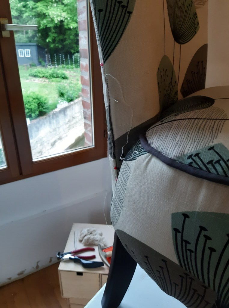 Fired with enthusiasm I immediately set to, stripped the old fabric off, painted the legs and started to recover it…