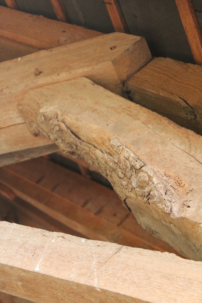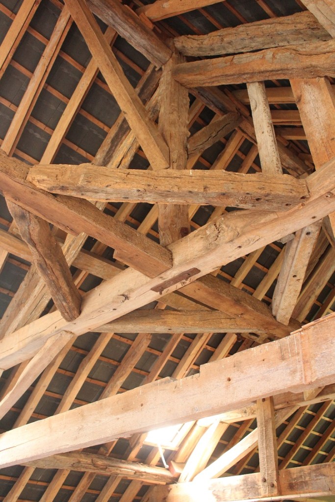 The left-hand end of the roof (looking at the front of the mill) has been remodelled several times, with the different extensions to the building and the timbers are relatively new but the right-hand end still shows much older, rough-hewn timbers (maybe re-used from another building?) and a structure dating back perhaps a couple of hundred years.