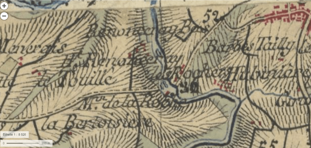 - The carte de l’état-major (1820-1866) reveals that the bridge, where the road from the village now crosses the river next to the mill, didn’t exist at that time.