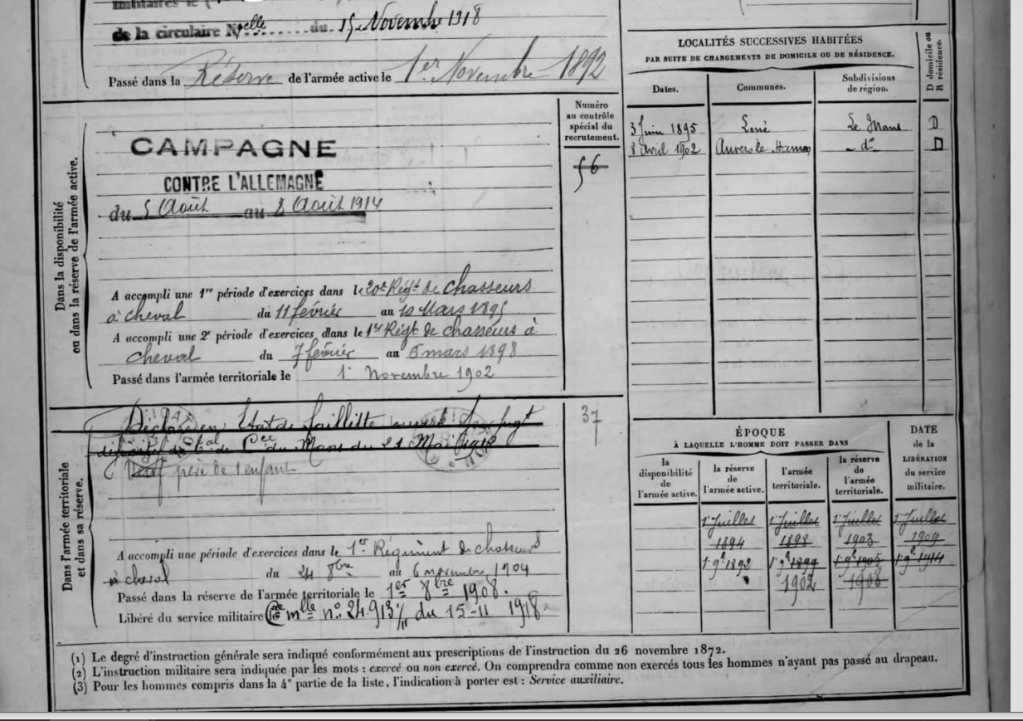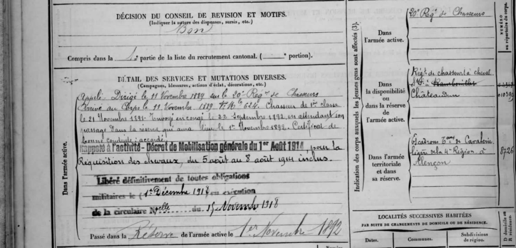 What I hadn’t realised was that every French male would have one of these records from the time he was first called up to do his military service at the age of 20 (compulsory military service was first introduced in 1798) and that it was updated regulary until he no longer had any obligation to serve.