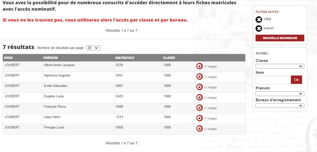 Then go to the Registres Matricules. In my case this was on the same page as the link for the alphabetical lists (see above).