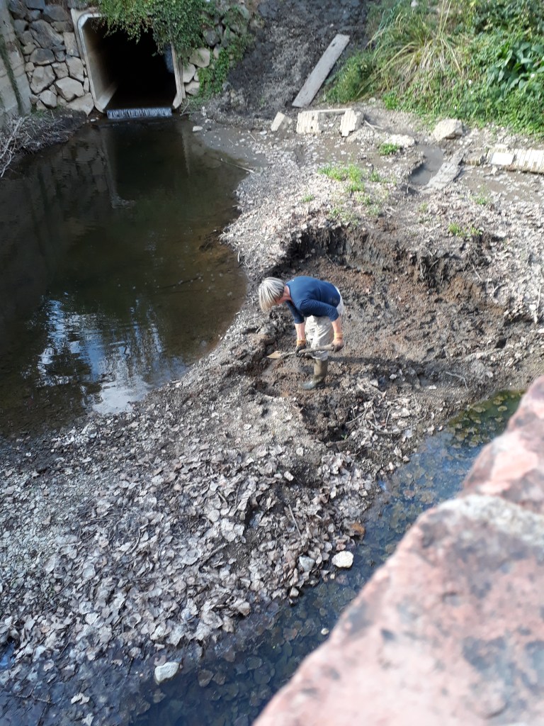 The draining of the leat had revealed a large solidified island of silt and debris in the middle of the leat which had been accumulating for at least 25 years since the mill was last used for milling. This needed to be removed to ensure the millstream flowed smoothly.