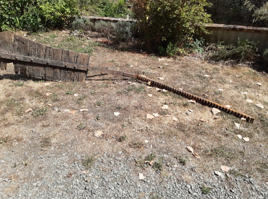 Once the rubbish was out we could see the extent of the damage. The vanne, large sluice gate had been bashed out of its runners, twisting the iron bars and racks that attached it to the rack and pinion lifting mechanism inside the house. In order to remove it, Colin had to saw through the ancient oak boards whereupon the two enormous racks fell to the bottom of the tunnel and had to be dragged out by hand, across the leat and out onto the bank on the other side. They were far too heavy to lift up over the wall.
