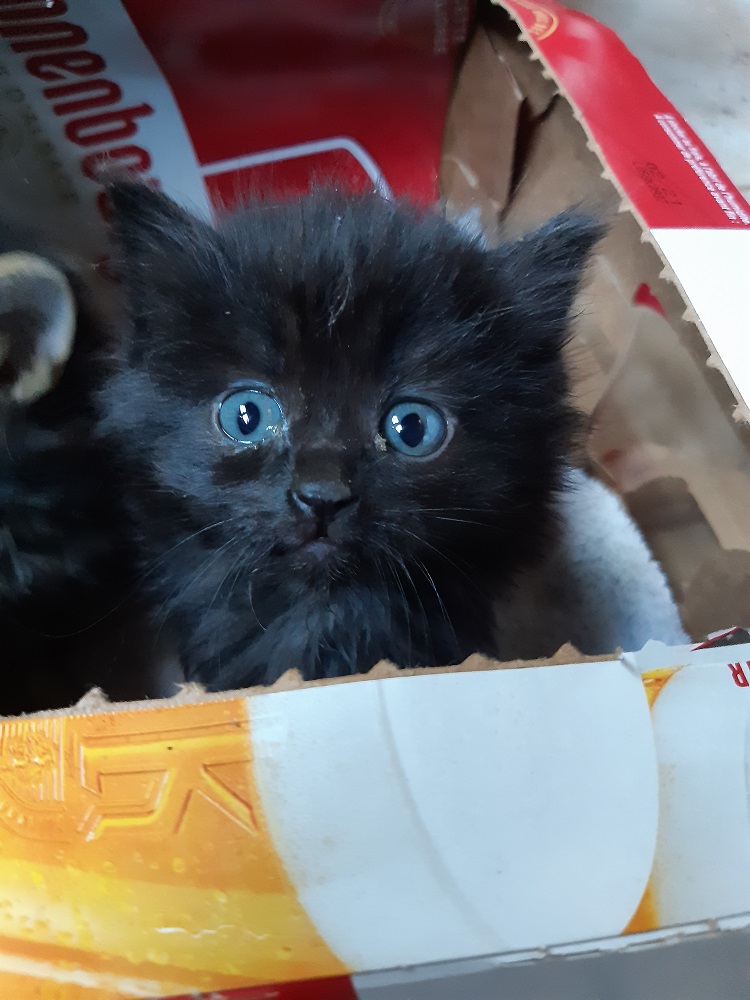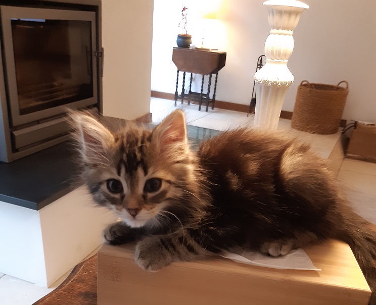 In May, we were devastated to find our beautiful kitten, Minuit, squashed on the lane outside the mill. Except, as we discovered a few hours later, when he sauntered in for his dinner, it wasn’t him but a farm cat from the farm up the lane (probably a sister). Two days later there was a tiny kitten squashed in the same place on the road. Colin went to investigate and found another two fortnight-old kittens in the hedgerow. “We can’t just leave them to starve”, he said, so after many weeks of hand-feeding these little scraps and getting a very unconvinced Minuit to accept a new brother and sister, we have a totally madcap family of charming, funny, loving and very entertaining felines.