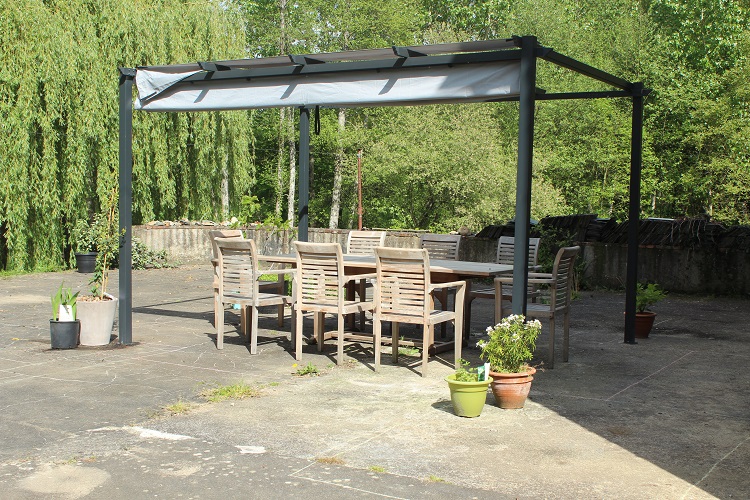 Colin added waterproof spotlights and a waterproof electricity socket under the table, so we have all mod cons, and I fitted additional roller blinds on the two long sides of the pergola, which can be lowered as required for blinding low sun at breakfast or apéro time.