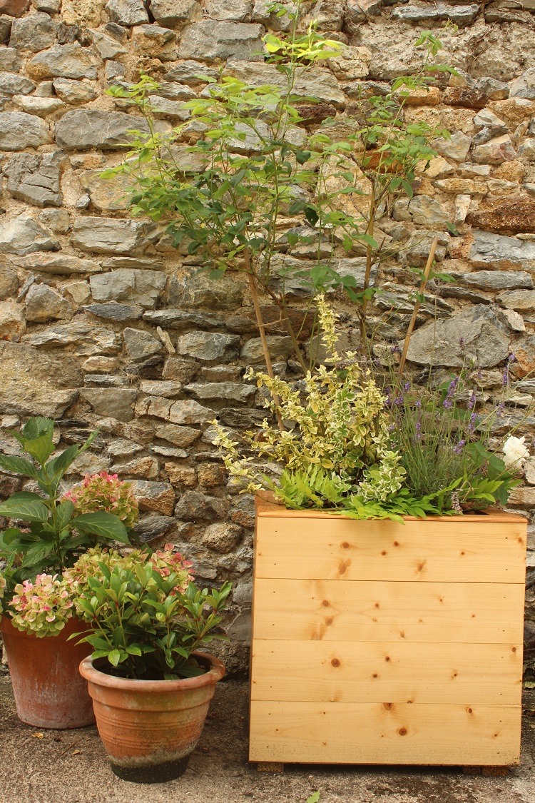 OK, a quick search on Pinterest and a couple of days later I had bought the required large black plastic dustbins (8€ each from the supermarket) and Colin crafted me some timber ‘cache-pots’ from floorboards and skirting boards to slip over the functional-but-ugly bins.